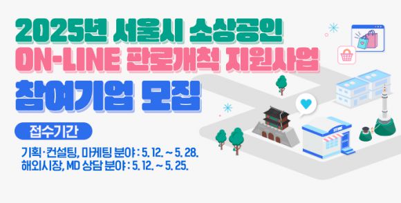 서울시는 소상공인의 디지털 경쟁력 강화를 위한 ‘2025년 소상공인 온라인 판로개척 지원사업’에 참여할 소상공인 1,050개 사를 5월 12일(월)부터 모집한다. 올해는 해외시장 진출 지원을 확대(30→50개 사)하고 ①기획·컨설팅 및 마케팅 분야, ②해외시장 진출 및 MD 상담 분야 등 두 가지 분야로 모집, 집중 지원한다는 계획이다.