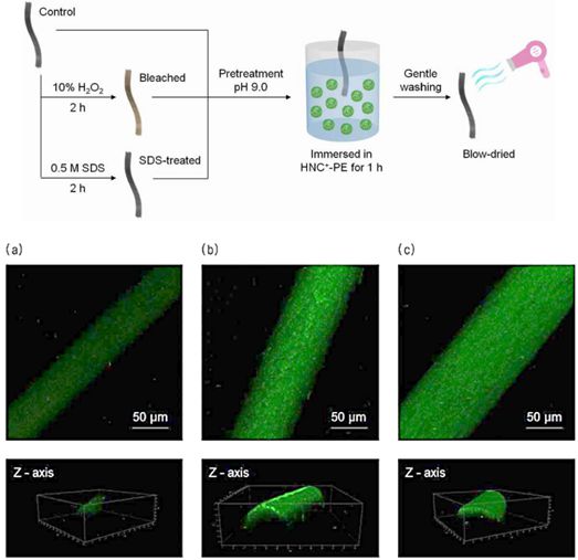 이를 극복하기 위해 연구팀은 셀룰로오스 섬유 표면에 양이온성 작용기를 도입하므로 정전기 인력의 작용 메커니즘을 통해 음전하를 띠는 모발 또는 물과 유용성 물질사이의 계면에 안정적으로 흡착될 수 있도록 설계했다.