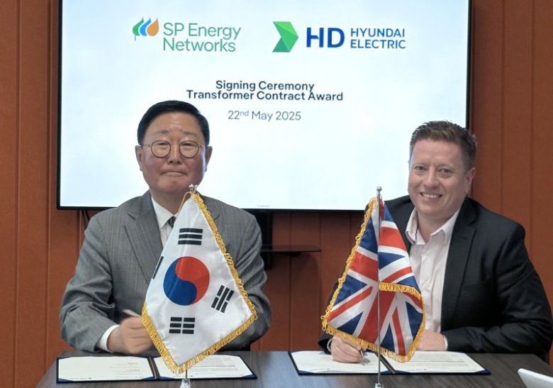 HD현대의 전력기기 및 에너지솔루션 계열사인 HD현대일렉트릭은 지난 22일 영국에서 스코틀랜드 전력회사 에스피 에너지 네트웍스(SP Energy Networks)와 400㎸(킬로볼트)급 초고압 변압기 4대에 대한 공급계약을 체결했다고 23일 밝혔다. 에스피 에너지 네트웍스 본사에서 열린 계약식에는 HD현대일렉트릭 조석 부회장과 에스피 에너지 네트웍스 에디 멀홀랜드 기술총괄이사 등 양사 주요 관계자들이 참석했다.