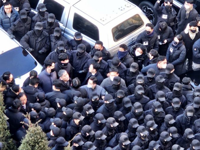 이대환 고위공직자범죄수사처(공수처) 부장검사 등 공수처 수사관들이 지난 1월3일 오전 서울 용산구 한남동 대통령 관저 검문소에 진입해 윤석열 대통령에 대한 체포영장을 집행하려 하자 육군 수도방위사령부 55경비단 병력이 수사관들을 둘러싸 저지하고 있다. /사진=뉴스1.