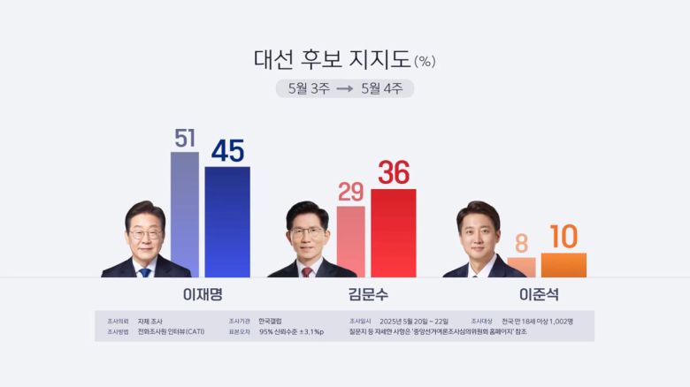 갤럽 "이재명 45%·김문수 36%·이준석 10%"