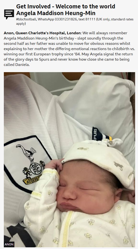 BBC는 런던 퀸 샬럿 병원에서 토트넘 유니폼을 입은 부모가 아이를 찍은 사진을 올리며 "세상에 태어난 것을 축하해, 우리는 안젤라 매디슨 흥민의 생일을 영원히 기억할 것"이라고 전했습니다.