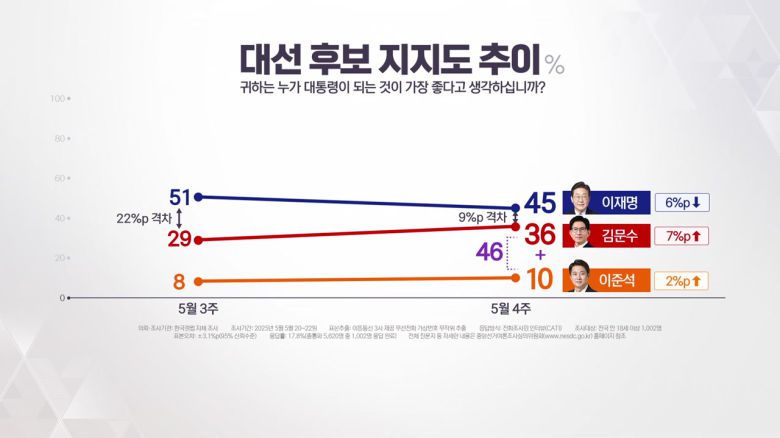 김문수, 이준석 두 후보의 지지율을 단순 합산하면 46%로 이재명 후보 45%에 오차범위 내에서 앞서는 것입니다.