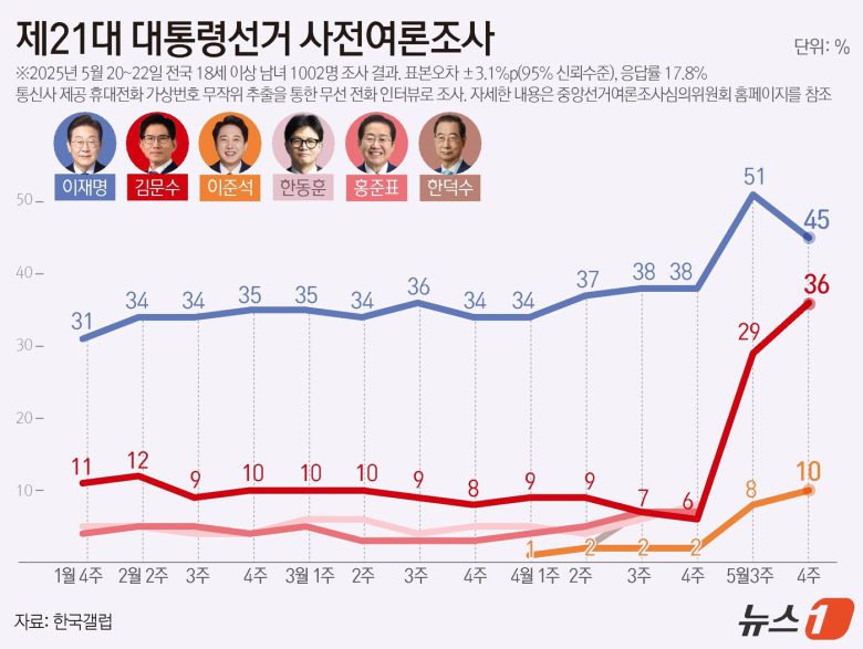 23일 한국갤럽이 지난 20~22일 전국 만 18세 이상 유권자 1002명을 대상으로 '누가 대통령이 되는 것이 가장 좋다고 생각하는지' 물은 결과, 이재명 후보는 전주 대비 6%p(포인트) 하락한 45%를 기록했다. 김문수 후보는 7%p 오른 36%, 이준석 개혁신당 후보도 2%p 오른 10%인 것으로 조사됐다.