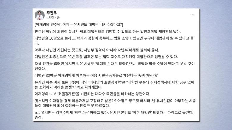주 의원은 자신의 SNS에, 민주당 주장처럼 학식과 경험, 법률 소양에 따라 대법관이 될 수 있다면, 민주당은 유 작가가 명예훼손 재판을 받아봤으니 소양이 있다고 우길 게 뻔하다고 주장했습니다.