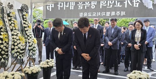 (제주=연합뉴스) 김호천 기자 = 오석환(왼쪽) 교육부 차관과 김광수 제주도교육감이 23일 오후 제주도교육청에 마련된 숨진 중학교 교사 분향소를 찾아 헌화한 뒤 묵념하며 고인의 명복을 빌고 있다. 2025.5.23 khc@yna.co.kr (끝)