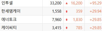 코스닥 시장에서는 에너토크, 케이씨티가 상한가로 거래를 마감했다. 이날 코스닥 시장에 상장한 인투셀은 공모가 1만6200원 대비 95.29% 오른 3만3200원에 거래를 마쳤다. 하한가를 기록한 종목은 없었다.
