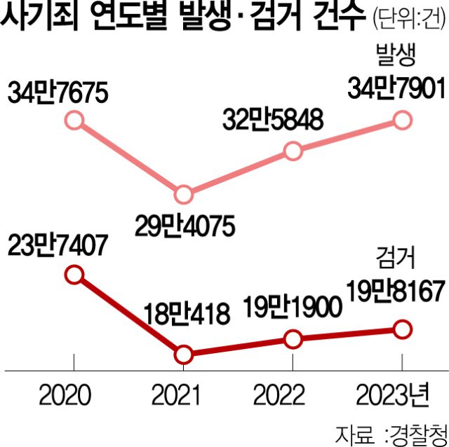 사기범죄는 2018년 27만 29건에서 2023년 34만 7901건으로 5년 만에 28% 이상 늘어났다. 반면 검거 건수는 2018년 20만 2300건에서 2023년 19만 8167건으로 되레 줄었다. 신종 사기의 경우 범행 역할별 조직화와 초국경 등의 특성을 보이며 상위 조직 검거가 어려워지고 있다. 경찰청이 제출한 자료에 따르면 2023년 보이스피싱 범죄 검거 인원 2만 2386명 중 조직 상선이 886명이었지만 지난해에는 2만 1833명 중 420명으로 떨어졌다. 올해 들어서 3월까지 6218명이 경찰에 붙잡혔지만 조직 상선은 1.1%에 불과한 70명에 그쳤다.