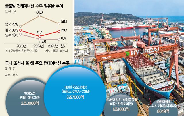 HD현대중공업(329180)이 일본 최대 해운사인 오션네트워크익스프레스(ONE)와 3조 6000억 원 규모의 컨테이너선 공급계약을 최종 조율 중인 것으로 나타났다. 컨테이너선은 지난해 중국 점유율이 86.6%에 달할 만큼 중국 조선사의 독무대였다. 하지만 올해 프랑스와 그리스·대만에 이어 일본까지 한국 조선소로 돌아오면서 컨테이너선 시장의 왕좌를 탈환할지 주목된다.