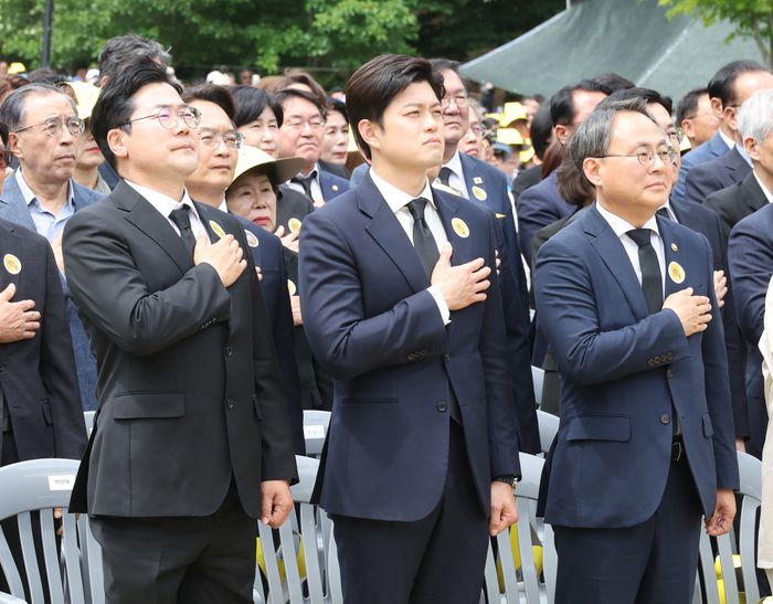 반면 이날 행사에 주요 정당 인사가 대거 참석한 만큼 확대해석은 경계해야 한다는 지적도 있다. 한 국민의힘 관계자는 “작년 추도식 때는 황우여 당시 비대위원장과 추경호 당시 원내대표가, 2년 전에는 권성동 원내대표가 참석했다”며 “있는 그대로만 봐주시라”고 당부했다.