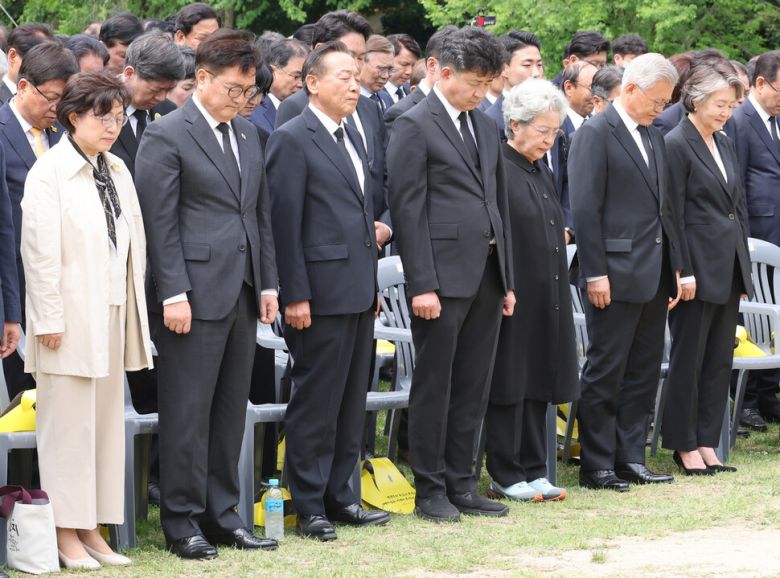 우원식 국회의장 부부(왼쪽부터), 차성수 노무현재단이사장, 노무현 전 대통령 아들 노건호씨, 권양숙 여사, 문재인 전 대통령 부부가 23일 경남 김해시 봉하마을에서 열린 고 노무현 전 대통령 16주기 추도식에서 묵념하고 있다. 공동취재사진 |