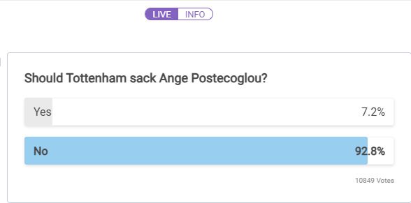 매체는 "유로파리그 우승에도 불구하고 토트넘이 포스테코글루 감독을 경질해야 할까?"라며 설문을 진행했고, 놀라운 결과가 나왔다. 1만849명이 투표한 가운데 무려 92.8%의 응답자가 'NO'에 투표했다.