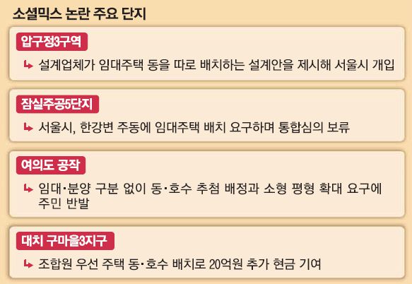 서울시가 임대·분양 가구를 구분하지 않고 한 단지 내에 완전히 섞어 배치하는 ‘소셜믹스 완전 혼합’ 방침을 고수하면서 서울 도심 재건축 현장마다 거센 반발이 이어지고 있다. ‘임대주택 차별 철폐’라는 정책 명분은 좋지만 현장에서는 설계권 침해, 사업성 악화, 조합원 재산권 침해 논란이 일고 있다.