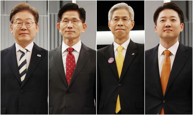23일 서울 영등포구 KBS본관 스튜디오에서 열린 중앙선거방송토론위원회 주관 제21대 대통령선거 2차 후보자토론회 시작에 앞서 각 정당 대선 후보들이 기념촬영을 하고 있다. (왼쪽부터) 이재명 더불어민주당, 김문수 국민의힘, 권영국 민주노동당, 이준석 개혁신당 대선 후보. 국회사진기자단
