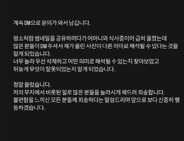 그는 "평소처럼 썸네일을 공유하려다가 어머니와 식사 중이어 급히 올렸는데 많은 분들이 DM(다이렉트 메시지)를 주셔서 제가 올린 사진이 다른 의미로 해석될 수 있다는 것을 알게됐다"며 "너무 놀라 우선 삭제하고 어떤 의미로 해석될 수 있는지 찾아보았다. 뒤늦게 무엇이 잘못됐는지 알게됐다"고 전했다.