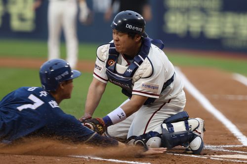 23일 잠실 경기 1회초 홈에서 태그 아웃되는 NC 김주원.[두산 베어스 제공. 재판매 및 DB 금지]