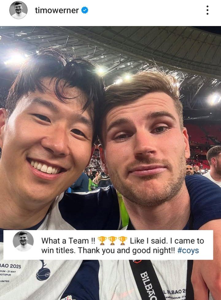독일 빌트는 23일(한국시간) "티모 베르너는 자신의 SNS에 우승 메달을 들어올린 사진, 미키 판 더 펜과 찍은 사진, 토트넘 주장 손흥민과 찍은 사진 3장을 올렸다. 베르너는 '대단한 팀이다. 내가 말했지? 나 토트넘에 우승하러 온 거야'라고 적었다"고 전했다.