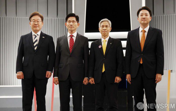 [서울=뉴스핌] 국회사진기자단 = 23일 서울 영등포구 KBS본관 스튜디오에서 열린 중앙선거방송토론위원회 주관 제21대 대통령선거 2차 후보자토론회 시작에 앞서 각 정당 대선 후보들이 기념촬영을 하고 있다. (왼쪽부터) 이재명 더불어민주당, 김문수 국민의힘, 이준석 개혁신당, 권영국 민주노동당 대선 후보. 2025.05.23 photo@newspim.com |