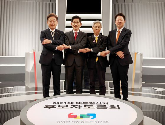 더불어민주당 이재명, 국민의힘 김문수, 민주노동당 권영국, 개혁신당 이준석 대선후보(사진 왼쪽부터)가 2차 TV 토론에 앞서 기념 촬영을 하고 있다. 〈사진=국회사진기자단·연합뉴스〉
