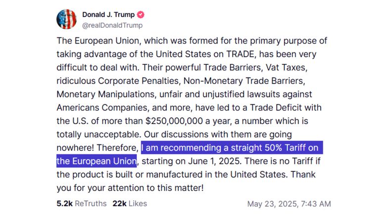 트럼프 미국 대통령이 "유럽연합에 6월 1일부터 곧장 50%의 관세를 부과할 것을 제안한다"고 밝혔습니다.
