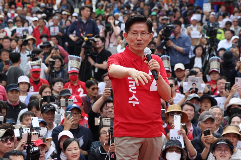 김문수 국민의힘 대통령 후보가 지난 22일 경기 광명시 철산로데오거리에서 열린 유세에 참석해 지지를 호소하고 있다./뉴스1 |