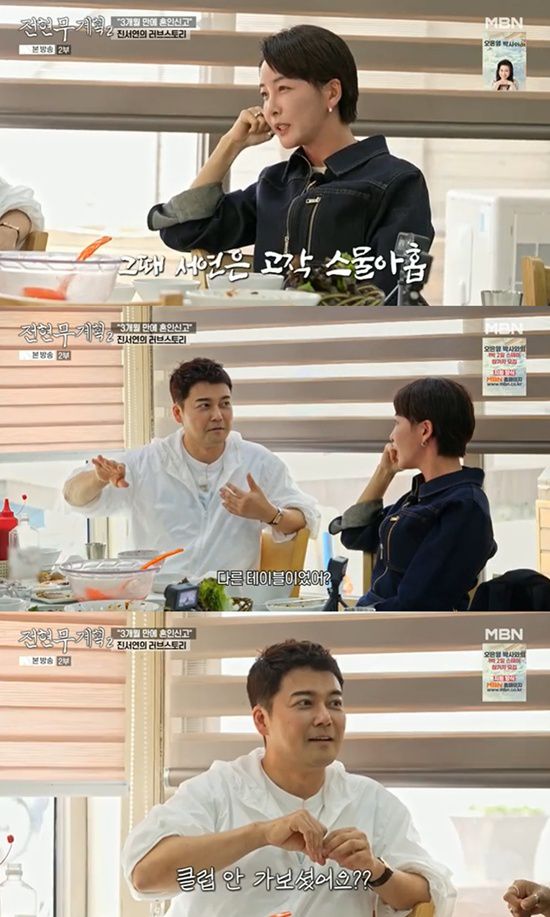 남편과 만난 지 3개월 만에 혼인신고를 했다는 진서연에게 전현무는 남편을 어떻게 만났느냐고 물었다. 진서연은 "이태원 클럽에서 춤추다가"라고 쿨하게 답했고, 이에 전현무는 "다른 테이블이었냐"고 했다.