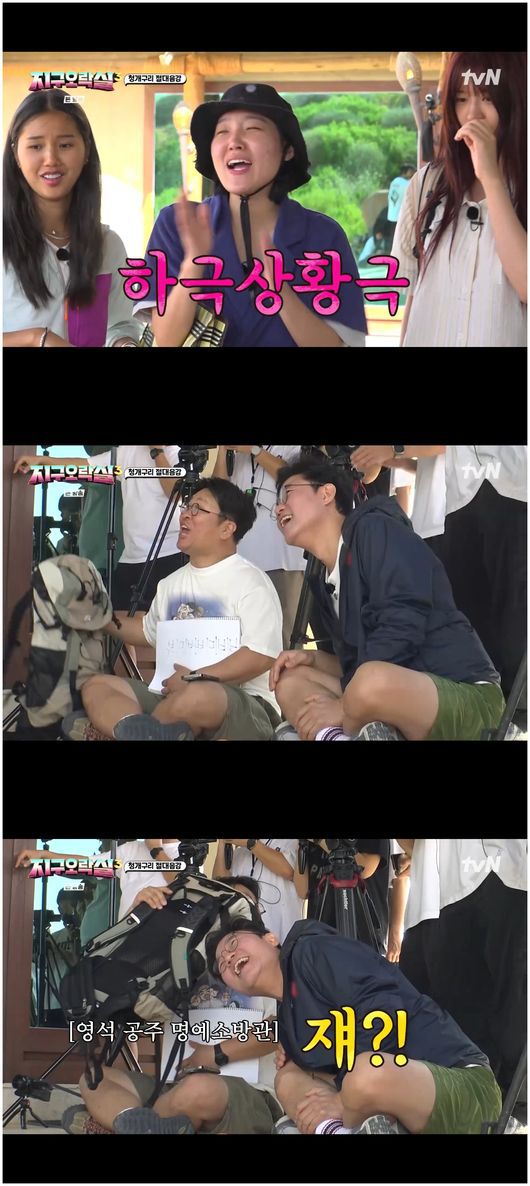 결국 작은 가방을 따낸 지락이들. 이영지는 “가방이 생각보다 너무 작다. 그리고 비닐 봉투가 너무 더럽다. 아무리 그래도 옷을 넣는 건데”라며 한숨을 쉬었다. 이은지는 “‘지구오락실’ 찍으면서 느는 건 짐 싸는 것뿐이다”라며 혀를 내둘었다.