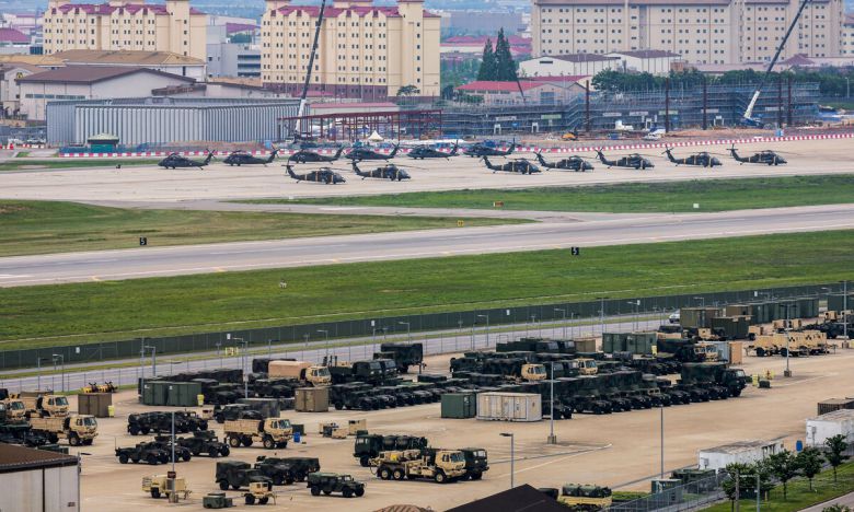23일 경기 평택시 캠프 험프리스에 주한미군 헬기와 전술차량들이 계류되어 있다. 뉴시스 |