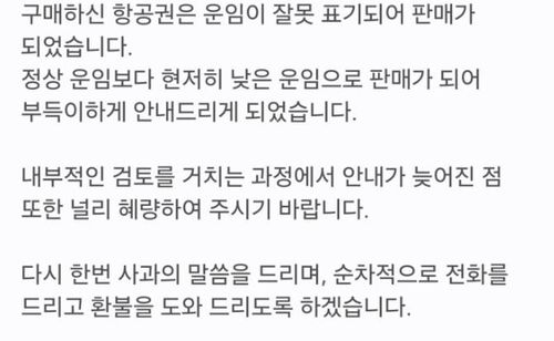 아시아나항공은 처음에는 '정상 운임보다 현저히 낮은 운임으로 판매가 되어 환불을 도와드리겠다'는 안내 문구를 배포했다가 많은 항의를 받았다.