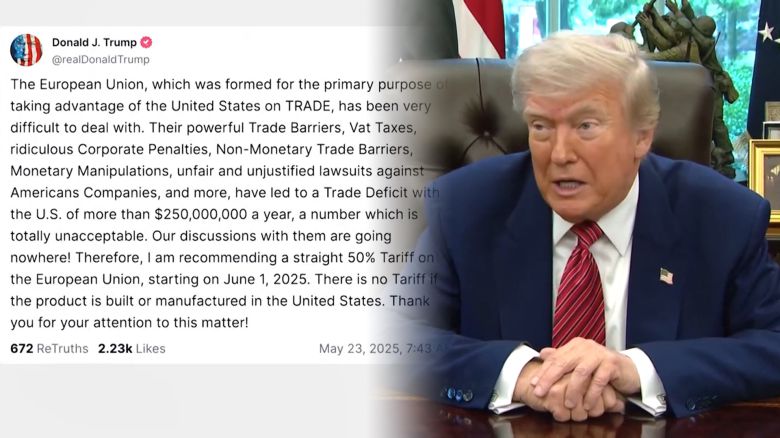 도널드 트럼프 미국 대통령이 현지시간 23일 "유럽연합, EU에 6월 1일부터 50%의 관세를 부과할 것을 제안한다"고 밝혔습니다.