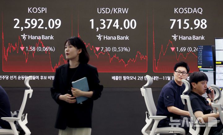 [서울=뉴시스] 김진아 기자 = 23일 서울 중구 하나은행 딜링룸에서 딜러들이 업무를 보고 있다. 코스피는 전 거래일(2593.67)보다 1.58포인트(0.06%) 내린 2592.09에, 코스닥지수는 전 거래일(717.67)보다 1.69포인트(0.24%) 하락한 715.98에 거래를 종료했다. 서울 외환시장에서 원·달러 환율은 전 거래일(1381.3원)보다 5.7원 내린 1375.6원에 마감했다. 2025.05.23. bluesoda@newsis.com |
