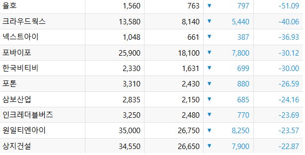 크라우드웍스(-40.06%), 넥스트아이(-36.93%), 포바이포(-30.12%) 등도 약세였다. 크라우드웍스의 경우 유상증자 결정 소식이 주가 하락에 영향을 미친 것으로 분석된다. 크라우드웍스는 344억 원 규모 유상증자를 결정했다고 21일 공시했다.