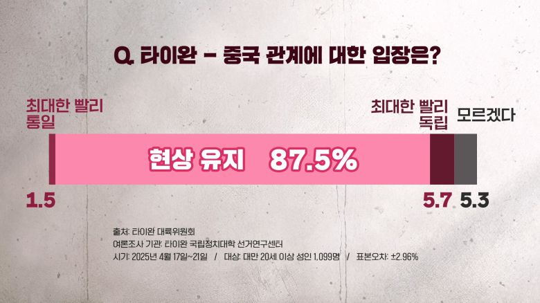 지금 저희가 보여드리는 여론 조사는 지난 4월 17일부터 21일까지 타이완 대륙위원회가 1,099명을 대상으로 진행한 여론조사 결과인데요. 타이완과 중국 본토의 관계에 있어서 현상 유지를 찬성하는 비율이 87.5%가 나왔습니다.