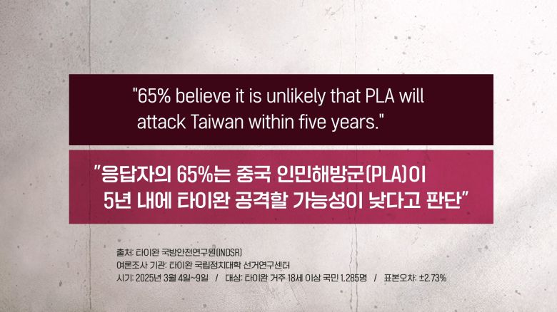 그러니까 중국군이 5년 내에 타이완을 공격할 가능성이 높지 않다라고 생각하는 응답 생각하는 응답자는 65%였는데요.