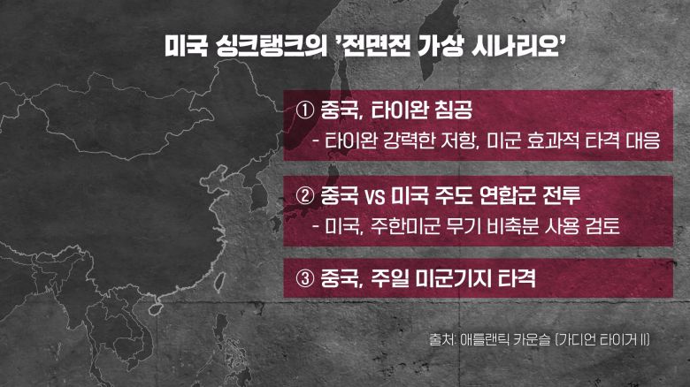 미국 싱크탱크는 타이완 침공이 한반도로 확전이 되는 시나리오까지 포함한 도상 훈련을 실시했고, 주한 미군 사령관은 타이완 유사 시 한국도 영향을 받는 국가 중 한 곳이라고 말했습니다.