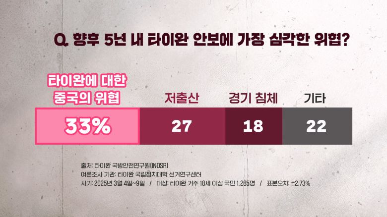 그리고 타이완 국방부의 싱크탱크가 수행한 여론조사에 따르면 33%의 응답자가 "중국 공산당의 위협"이 향후 5년 내에 국가 안보에 대한 가장 심각한 위협이라고 생각한다고는 했지만 과반 이상이 단기간 내에 타이완 해협 전쟁이 발생할 것이라고 생각하지는 않는 것으로 나타났거든요.