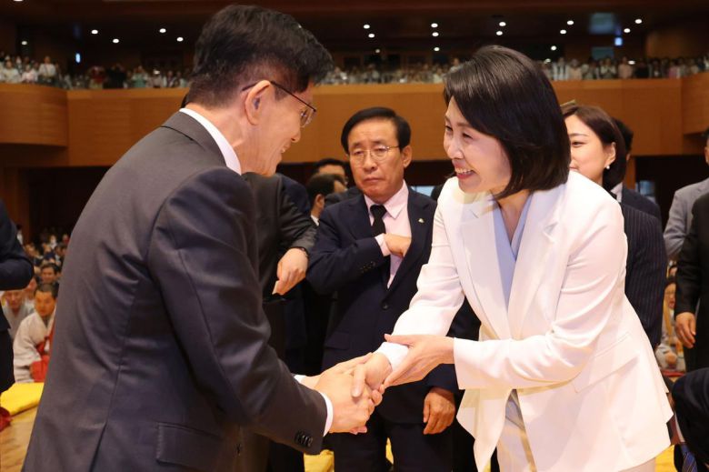 김문수 국민의힘 대선 후보가 24일 오전 충북 단양군 구인사에서 열린 상월원각대조사 제51주기 열반대재에 참석해 이재명 더불어민주당 대선후보 배우자 김혜경 여사와 인사하고 있다  2025.05.24. 뉴시스