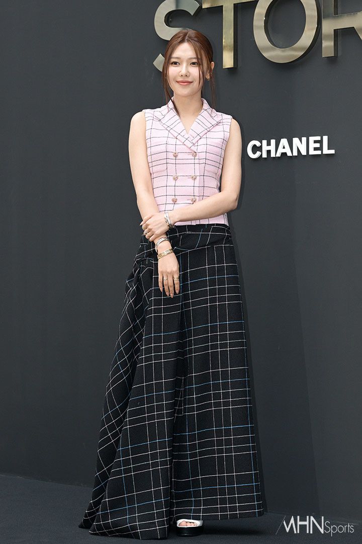 지난 2024년 7월 샤넬 코코 크러쉬 오픈 포토콜에 참석한 그녀는 체크 패턴을 상하의에 각각 활용한 믹스매치로 또 다른 패션 정점을 찍었다. 핑크 컬러의 트위드 슬리브리스 재킷은 샤넬 특유의 클래식함을 보여주며 금장 버튼으로 포인트를 줬다.