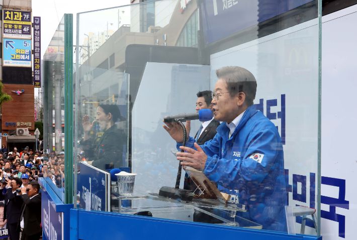더불어민주당 이재명 대선 후보가 24일 경기 부천시 부천역 북부광장에서 열린 유세에서 시민들에게 지지를 호소하고 있다. 연합뉴스