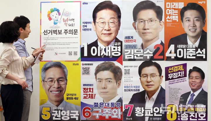 [인천=뉴시스] 전진환 기자 = 제21대 대통령선거를 20일 앞둔 14일 인천 미추홀구 선거관리위원회에서 직원들이 접수된 후보들의 선거벽보를 살펴보고 있다. 2025.05.14. amin2@newsis.com |