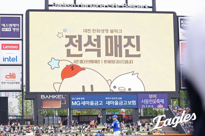 한화는 23일 대전 한화생명 볼파크에서 열린 2025 신한 SOL Bank KBO리그 롯데와의 홈경기에서 1만7000석 전석 매진을 달성했다. 이날 한화는 경기 개시 약 1시간 반 전인 오후 12시 25분 매진이 되었다고 발표했다. 한화의 시즌 24번째 매진이자, 홈 20경기 연속 매진 신기록이다.