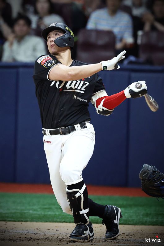 KT는 4회초 2사에서 황재균의 솔로홈런으로 한 점을 더 올렸다. 5회에는 선두타자 안현민이 3루타를 날렸고 로하스는 볼넷을 골라냈다. 강백호는 1타점 적시타를 때려냈고 허경민은 3루수 병살타를 쳤지만 이어진 2사 2루에서 김상수가 1타점 적시타를 날려 8-2를 만들었다.
