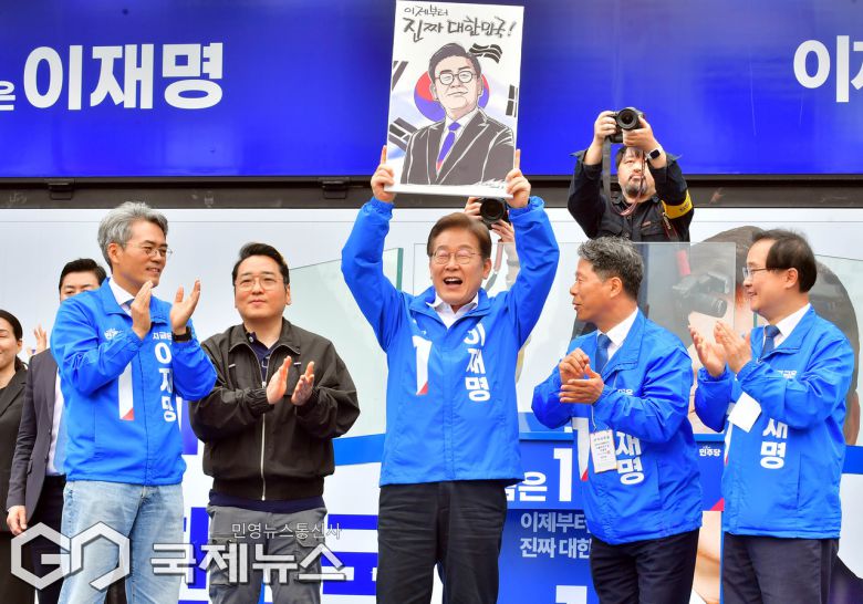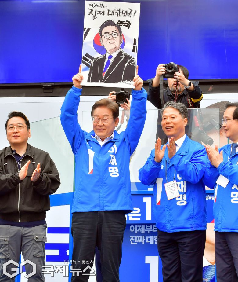 (부천=국제뉴스) 이재명 더불어민주당 대통령 후보가 24일 오후 경기도 부천시 부천역 북부광장에서 열린 유세에서 자신의 캐리커처 그림을 들어 보이고 있다./사진=이용우 기자