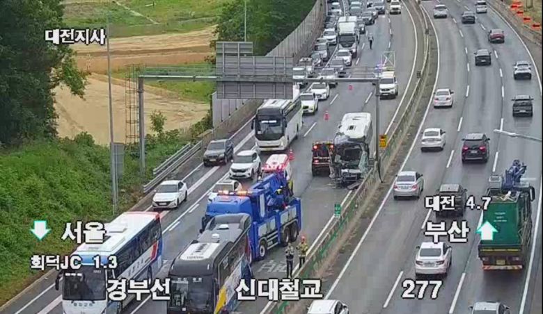 24일 소방당국 등에 따르면 이날 오후 4시 17분경 대전 경부고속도로 서울 방향 회덕분기점 인근 277㎞ 지점에서 대형 버스 2대가 부딪혔다. 이 사고로 버스에 타고 있던 1명이 중상을, 4명이 경상을 입고 병원으로 옮겨졌다. 사고는 뒤따라오던 버스가 속도를 줄이지 못하고 앞서가던 버스를 들이받으면서 일어난 것으로 파악됐다.