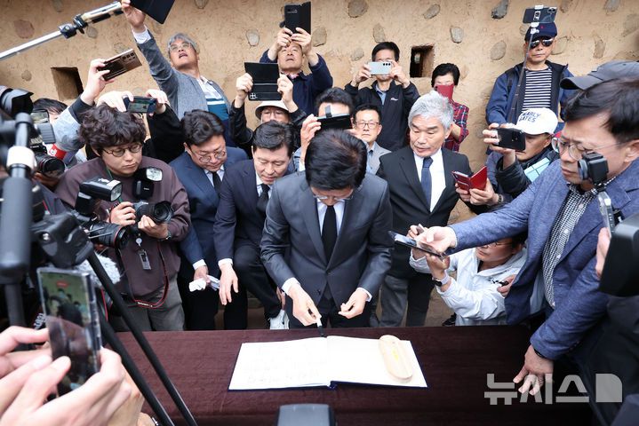 [구미=뉴시스] 권창회 기자 = 김문수 국민의힘 대선 후보가 24일 경북 구미시 박정희 전 대통령 생가를 방문해 방명록을 작성하고 있다. 2025.05.24. kch0523@newsis.com |