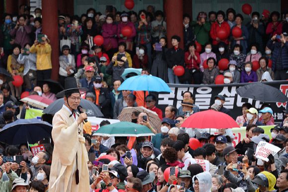 이후 안동 웅부공원 유세에선 도포와 갓을 입고 등장했다. 김 후보는 "민주당은 국회 독재뿐 아니라 행정부·사법부까지 장악해 완전한 독재로 가고 있다"며 "자신의 유죄를 없애려는 정당에 국민이 심판을 내려달라"고 호소했다.