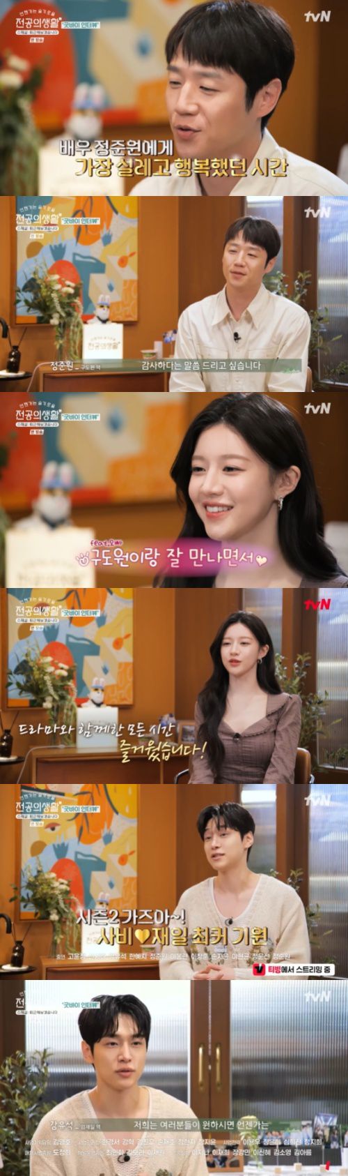 24일 오후 방송된 tvN '언젠가는 슬기로울 전공의생활 스페셜-퇴근해보겠습니다'에서는 카페 ‘구릉도원’에 모인 ‘풍년즈’ 고윤정(오이영 역), 신시아(표남경 역), 강유석(엄재일 역), 한예지(김사비 역), 정준원(구도원 역)이 비하인드 스토리를 대방출했다.