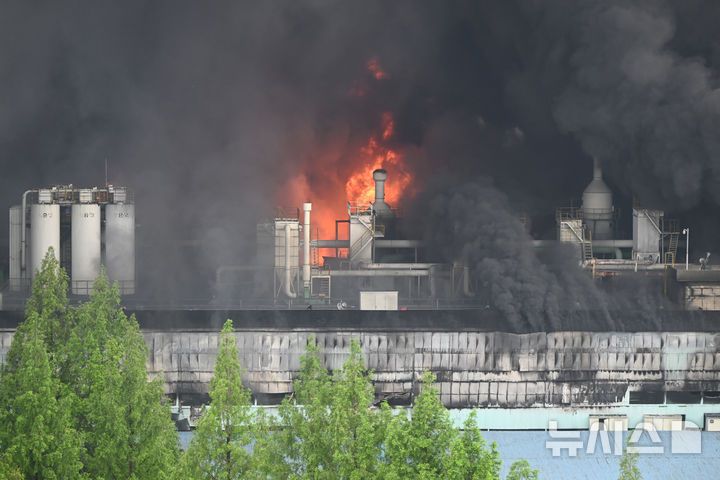 [광주=뉴시스] 박기웅 기자 = 17일 오전 7시11분께 광주 광산구 소촌동 금호타이어 광주공장에서 불이 나 소방 당국이 불을 끄고 있다. 이날 불은 타이어 생산에 필요한 고무를 정련하는 과정에서 발생한 것으로 추정되고 있다. 2025.05.17. pboxer@newsis.com
