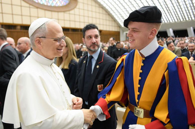 교황 레오 14세가 24일 바티칸의 로마 교황청 및 바티칸 직원들과 함께 청중 앞에서 스위스 근위대를 맞이하며 인사를 받고 있다. AFP 연합뉴스 |