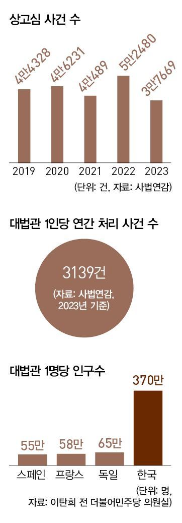 이렇게 사건을 대법관 대신 연구관이 처리하는 이유는 하나다. 사건 수에 비해 대법관 숫자가 턱없이 부족해서다. 사법연감을 보면 2023년 기준 상고사건은 3만7669건에 달한다. 실제 재판업무에 투입되는 12인에 산술적으로 대입하면 대법관 1인당 3139건을 처리해야 한다. 각 소부 재판부는 4인으로 구성되는데, 소부 사건으로 넘어오는 사건 수로 보면 1만2556건(3139건x4명)이 된다. 대법관이 365일 내내 일한다고 해도 1인당 하루 34건을 처리하는 셈이다. 상고심이 ‘10초 재판’으로 운용되고 있다는 이야기를 과장으로만 볼 수 없는 이유다. 소송당사자들 입장에선 매우 허술한 상고 시스템에 명운을 맡기고 있는 것이다.